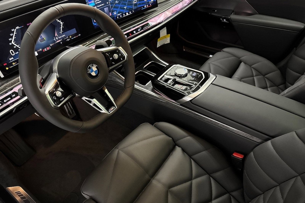 WHEELS: 21" M AERO JET BLACK STYLE 909M -inc: 21" x 9.0" front and 21" x 10.5" rear, Tires: 255/40R21 Fr & 285/35R21 Rr Staggered Summer, Increased Top Speed Limiter, PREMIUM PACKAGE -inc: Driving Assistant Plus, Parking Assistant Professional, drive recorder, Parking View w/3D View (Surround View), Illuminated Kidney Grille, Parking Assistant Delete, MIRROR OAK HIGH GLOSS TRIM, M SPORT PROFESSIONAL PACKAGE -inc: M Sport Brakes w/Black Calipers, M Sport Package Pro, Extended Shadowline Trim, Rear Spoiler, M Sport Pro Contents, DRIVING ASSISTANCE PROFESSIONAL PACKAGE -inc: Highway Assistant Limited Term, ACC w/Stop & Go, Active Lane Keeping Assistant w/side collision avoidance, hands-off driving up to 85mph on closed access highways, automatic lane change, evasion assistant and cross-traffic alert front, Driving Assistant Professional, BLACK, VEGANZA UPHOLSTERY, BLACK SAPPHIRE METALLIC, Wireless Phone Connectivity, Wheels: 20" M Aero Bicolor Style 907M -inc: 20" x 9.0" front and 20" x 10.5" rear, Veganza Upholstery. This BMW 7 Series has a dependable Intercooled Turbo Gas/Electric I-6 3.0 L/183 engine powering this Automatic transmission.