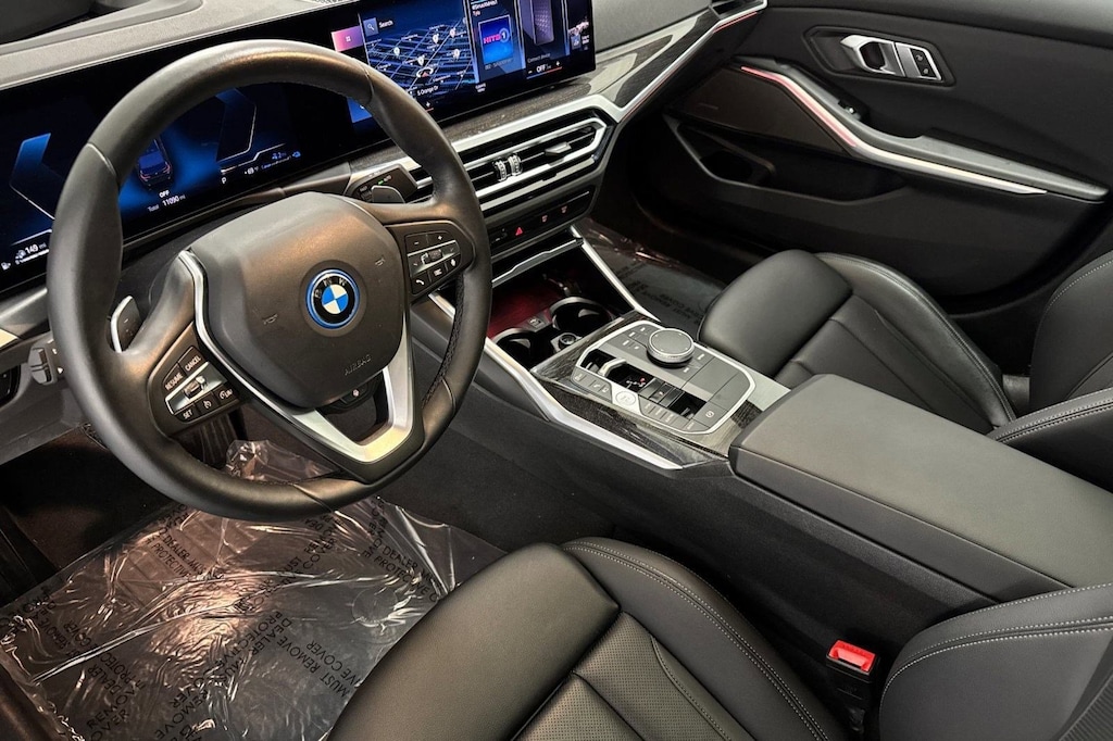 This 2023 BMW 3 Series 330e is a One Owner vehicle, exterior, and interior. Key features include PARK DISTANCE CONTROL, PREMIUM PACKAGE, HEATED FRONT SEATS, HEATED STEERING WHEEL, HARMAN/KARDON SURROUND SOUND SYSTEM, BLACK PERFORATED SENSATEC UPHOLSTERY, HIGH GLOSS FINE WOOD ASH GREY-BROWN TRIM, DRIVING ASSISTANCE PACKAGE, Sun/Moonroof, Immobilizer, Back-Up Camera and much more!
